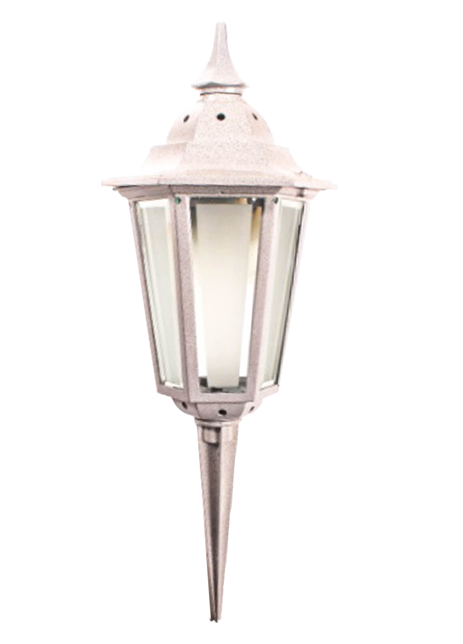 Gravlygte i støbt aluminium, som ikke ruster. Beregnet til olielys eller batterilys 10107. Lygten stikkes ned i jorden med medfølgende jord-spyd. Leveret 8/fpk