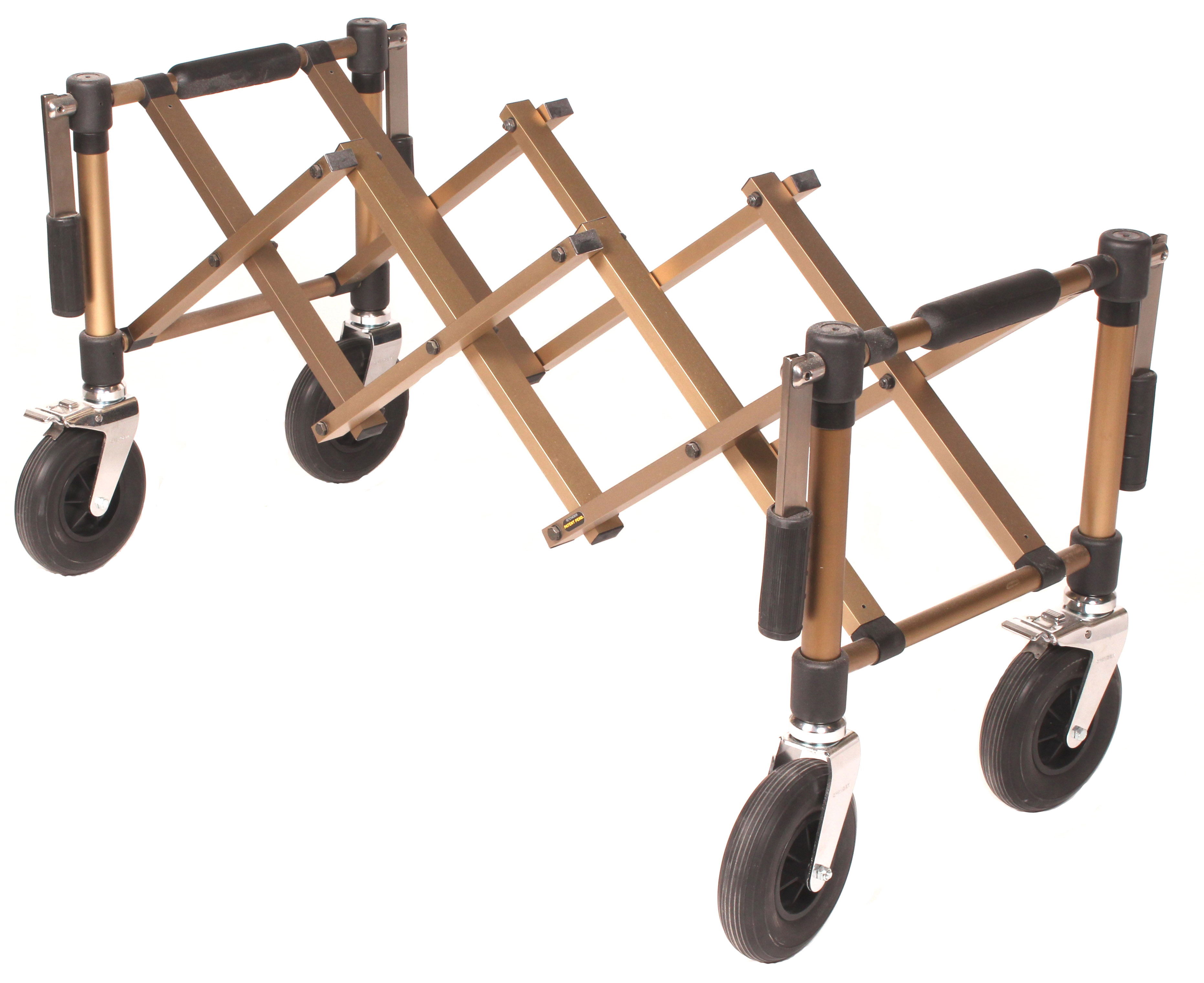 Kvalitetsvogn fra Spencer. Den robuste base er lavet af kraftige bruneloxerede rektangulære aluminiumsrør. Gummifødder hjælper med at sikre kisten på plads. 20 cm gummihjul ruller let på tæpper, tærskler og andre forhindringer. Når vognen flyttes med eller uden kiste, er der fire udfoldelige håndtag, der muliggør nem transport