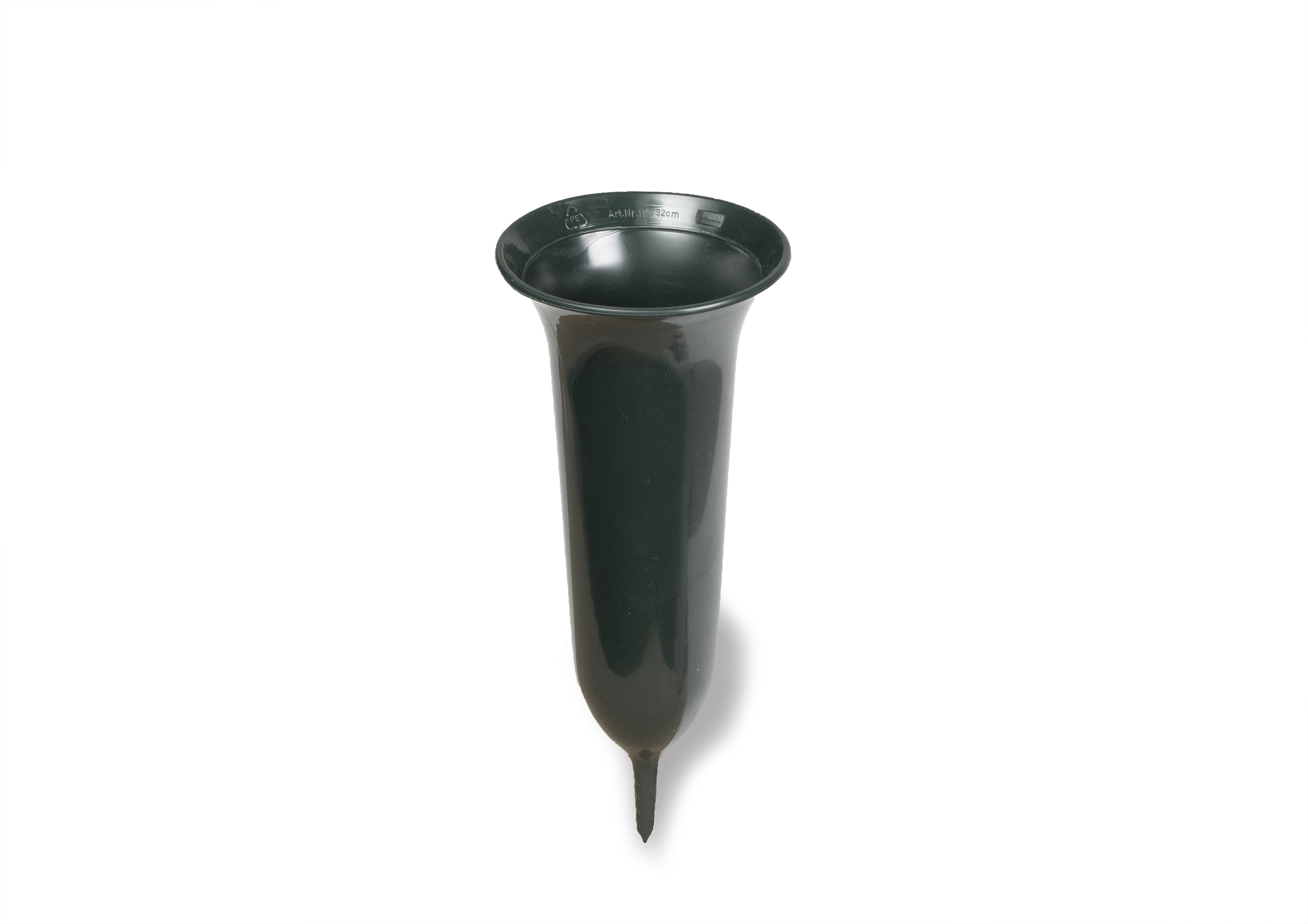 Rund gravvase i PE-plast med jordspyd, der får den til at stå fast i jorden. Vasen er 24 cm dyb og indeholder 8 dl