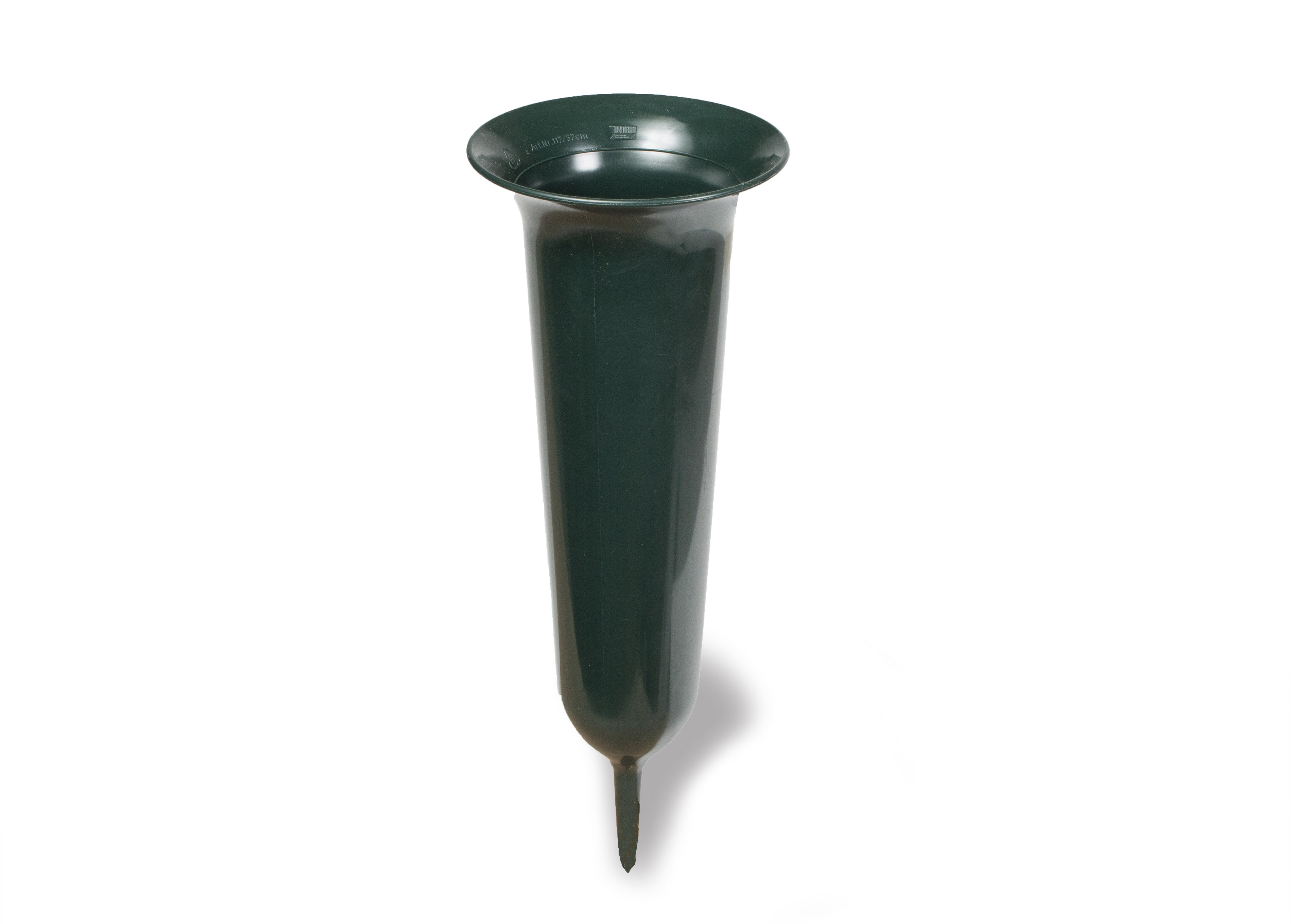 Rund gravvase i PE-plast med jordspyd, der får den til at stå fast i jorden. Vasen er 30 cm dyb og indeholder 1,2 liter