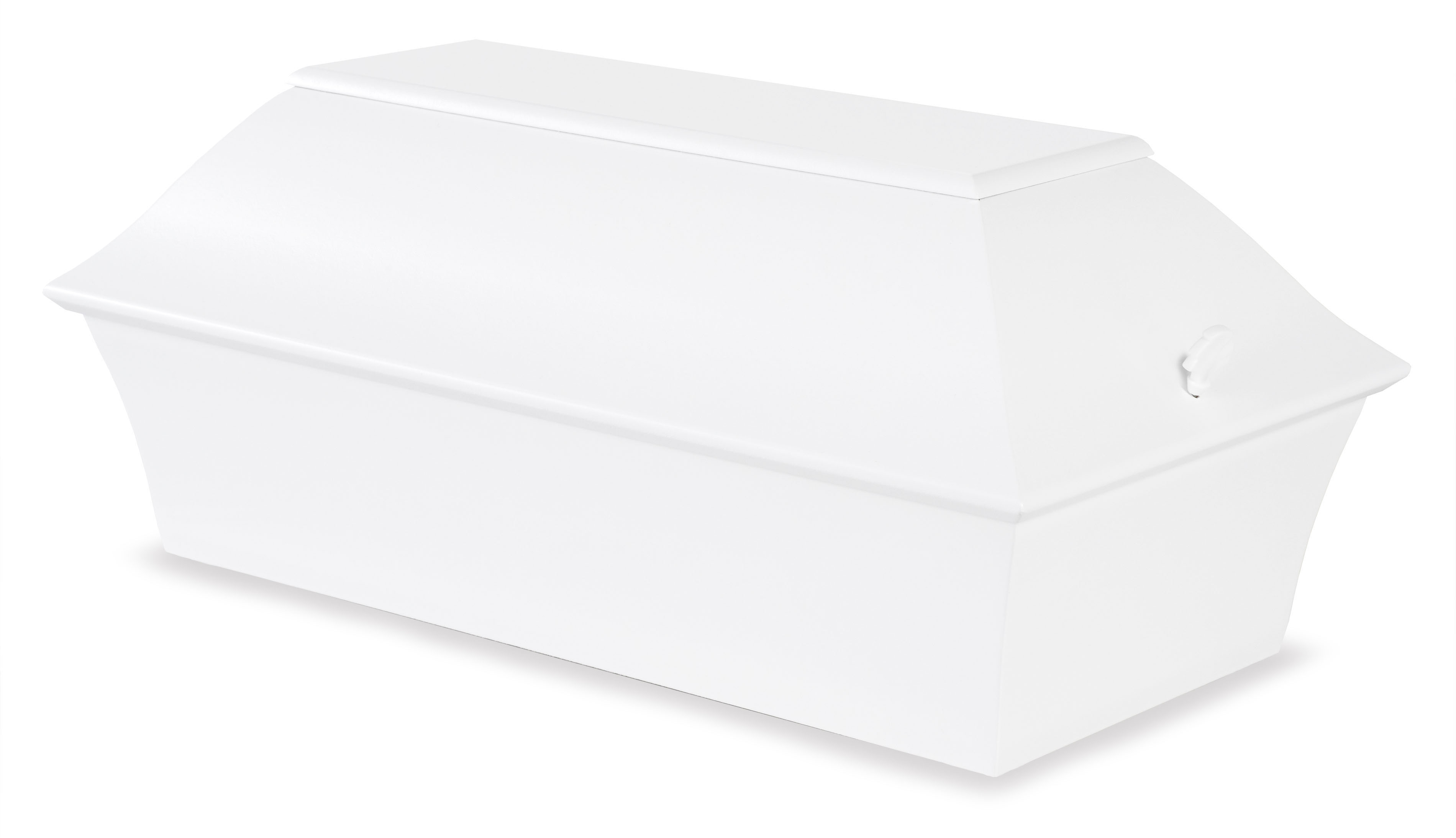 Hvidmalet barnekiste af møbelplade. 60 cm. Kiste og låg er beklædt med flonelstof. Pude, tæppe og madras medfølger. Kisten kan også bestilles blå eller lyserød malet