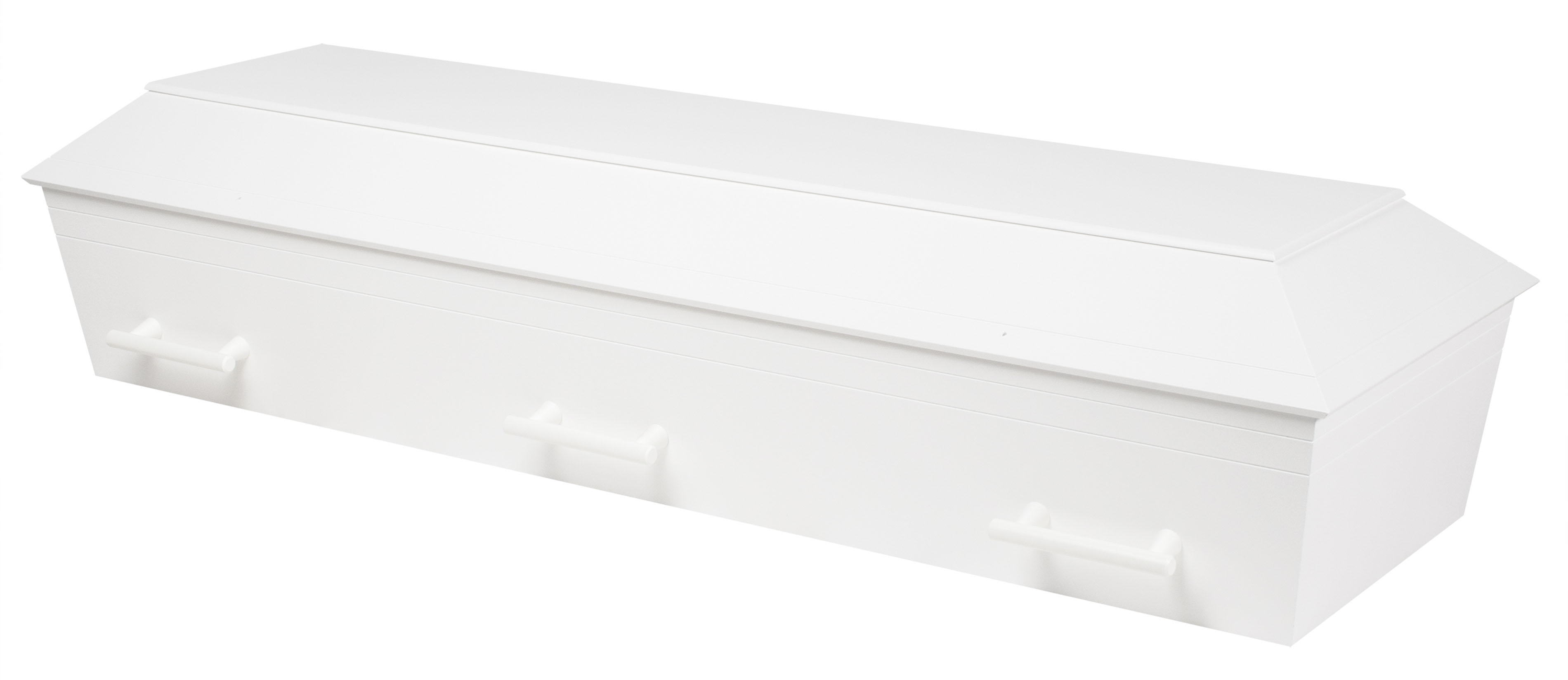 Hvidmalet kiste, fremstillet af spånplade. 6 håndtag. Indvendigt beklædt med glat stof Madras og pude medfølger.