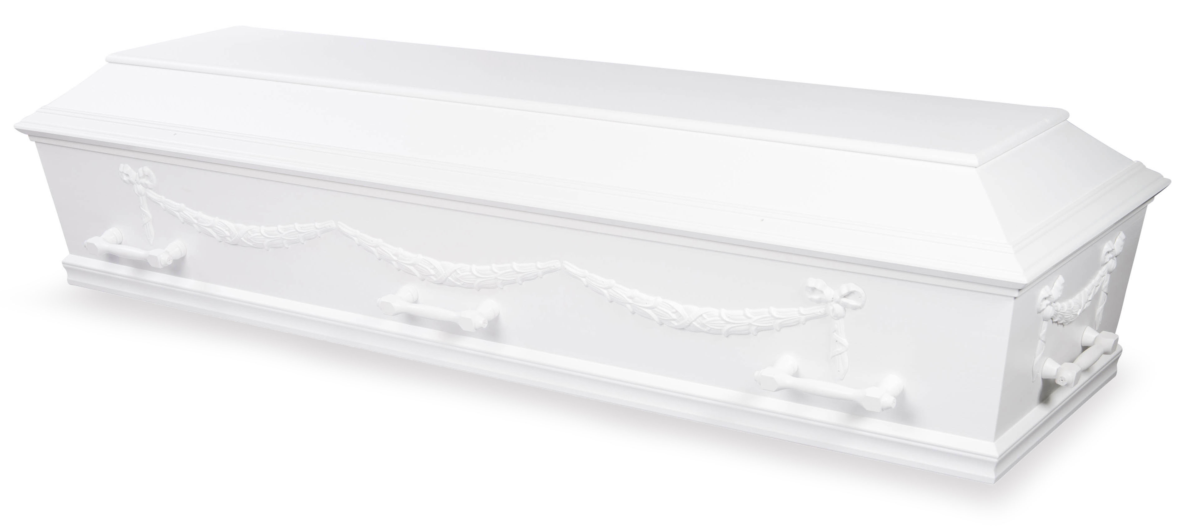 Hvidmalet kiste med guirlander, fremstillet af massiv fyr. 8 håndtag. Indvendigt beklædt med quiltet stof. Madras og pude medfølger.